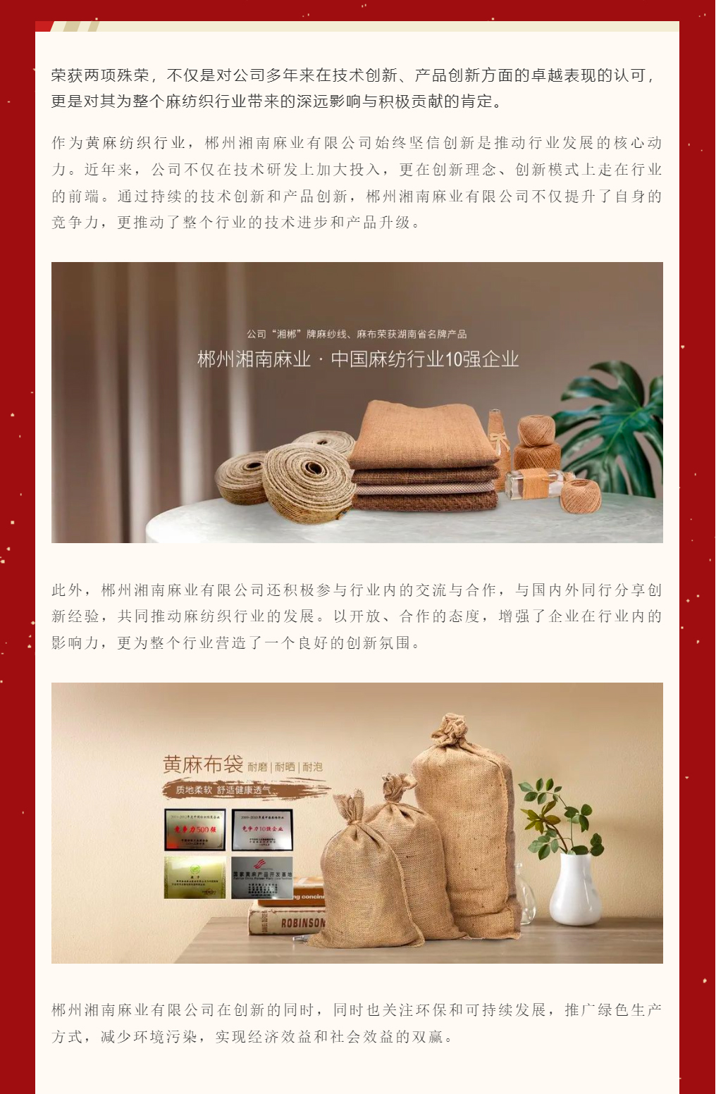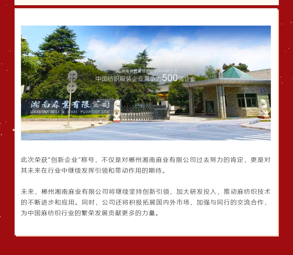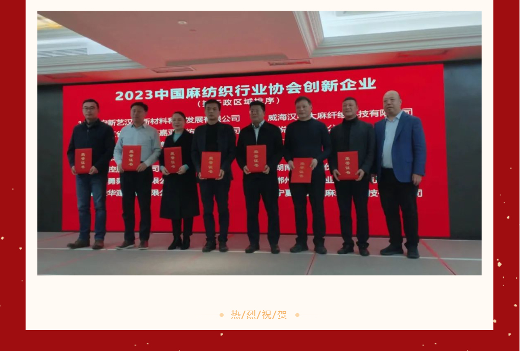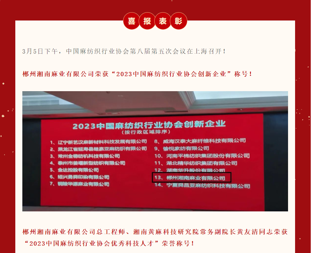 喜報(bào)|郴州湘南麻業(yè)有限公司榮獲2023中國麻紡織行業(yè)協(xié)會創(chuàng)新企業(yè)